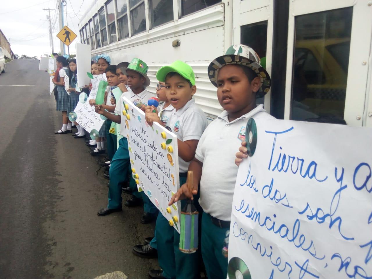 Con pancartas y artículos de materiales reciclados, niños de distintos grados del colegio salieron la mañana de este miércoles cerca de los predios del plantel para transmitir sus mensajes sobre educación ambiental.