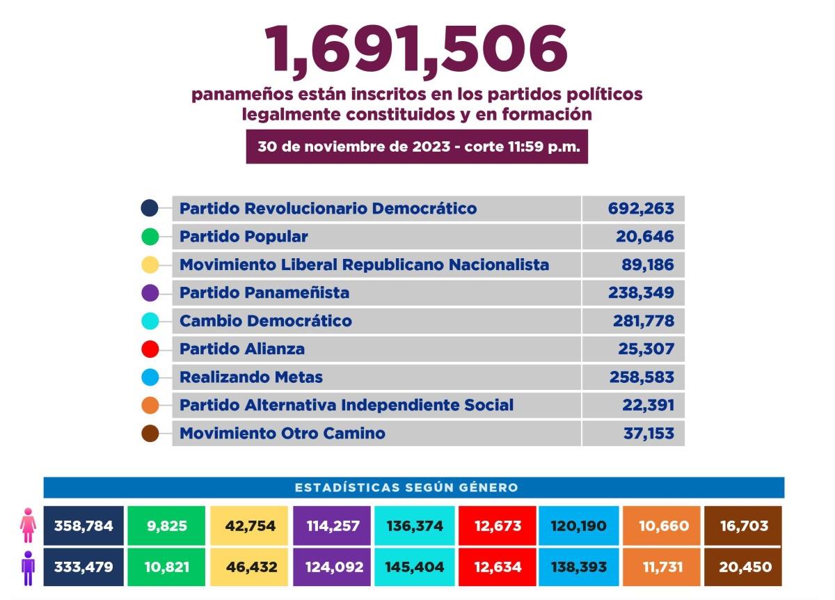 En tanto, los otros nueve colectivos políticos legalmente constituidos y en formación se reparten el resto de los 1,691,506 panameños inscritos en los distintos partidos hasta las 11:59 p.m. de ayer jueves, 30 de noviembre, es decir, que de los 3,045,329 ciudadanos que aparecen en el Registro Electoral, el 55.54 % está afiliado a un colectivo político y el 44.46 % no pertenece a ninguno.