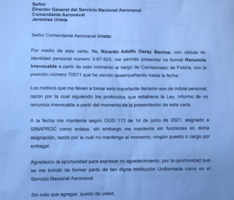 "Yo, Ricardo Adolfo Garay Barrios.... me remito a presentar mi formal renuncia irrevocable a partir de este momento, al cargo de comisionado de Policía, con la posición número 70571, que he venido desempeñando hasta la fecha", señala el ahora excomisionado, quien adujo motivos personales.