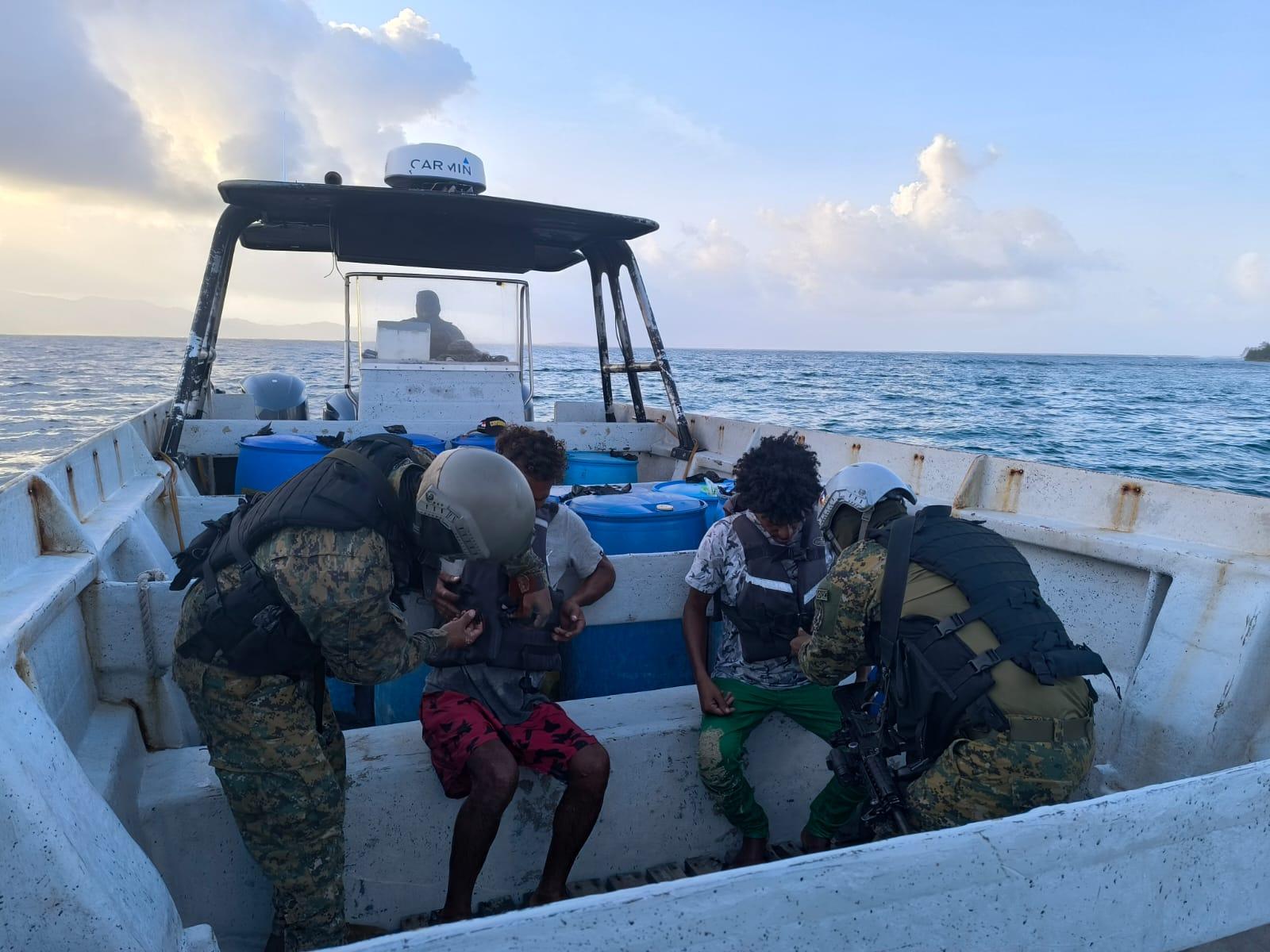 Unidades del Batallón de Botes Especiales de Senafront rescataron a los colombianos Jhonny Geles y Alejandro Torrealba, quienes permanecieron varios días a la deriva en aguas de Guna Yala.