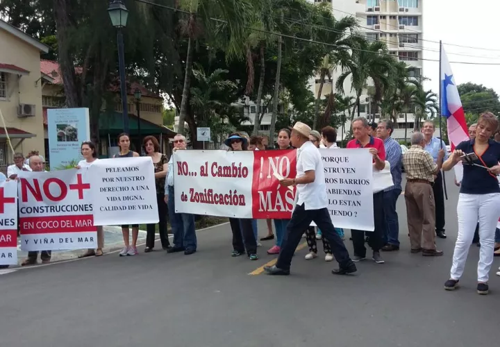 Residentes de San Francisco protestan hoy, lunes, en la vía principal frente a la iglesia San Francisco de La Caleta, rechazando el cambio de zonificación.