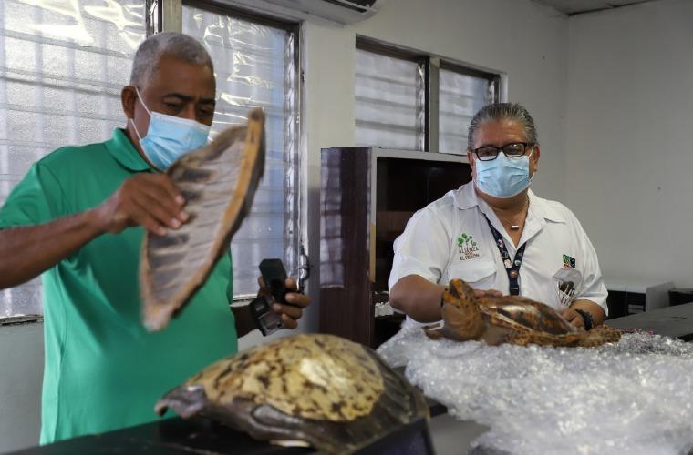 Ante la alerta, técnicos del Ministerio de Ambiente (MiAMBIENTE) y miembros de la Dirección de Investigación Judicial de la Unidad de Delitos Ambientales se sumaron al operativo y determinaron que se trataba de dos caparazones de tortuga juveniles, uno de la especie Carey (Eretmochelys imbricata) y otro de quelonio Verde (Chelonia mydas); además de una pieza completa de tortuga Carey disecada.