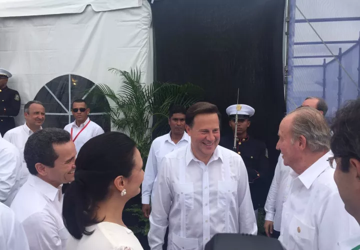 En la nueva esclusa de Cocolí, en la vertiente del Pacífico, el rey emérito saludó al presidente panameño, con quien está revisto sostenga un encuentro privado.