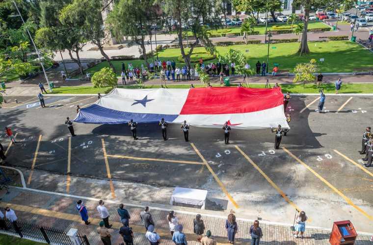 Seguidamente, la Guardia de Honor del SPI procedió al acto de doblez de la bandera más grande de Panamá, tras lo cual la presentó para que el viceministro de Finanzas encargado, Publio De Gracia, la entregara a la gobernadora de la provincia de Panamá, Carla García, teniendo como testigo de honor a la ministra de Gobierno, Janaina Tewaney Mencomo.