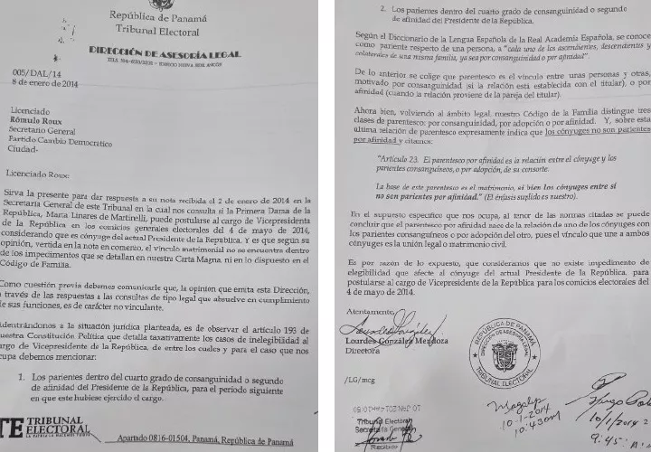"Consideramos que no existe impedimento de elegibilidad que afecte al cónyuge del actual Presidente de la República para postularse al cargo de Vicepresidente de la República para los comicios electorales del 4 de mayo de 2014", señala la respuesta de Lourdes González Mendoza, directora de asesoría legal del Tribunal Electoral.