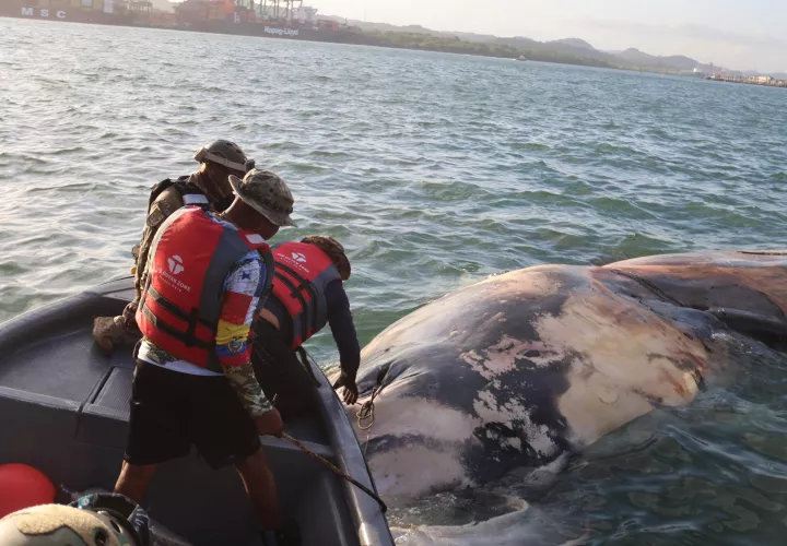 Balboa, Panamá. Una ballena apareció muerta bajo el Muelle 16, en Ancón, y la Aeronaval tuvo que entrar al quite.