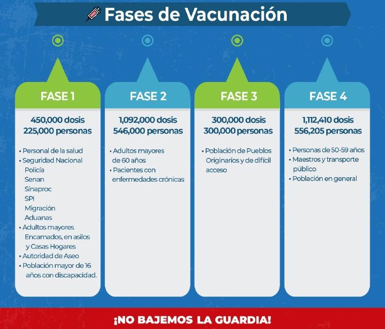Son cuatro fases de vacunas. La 1ra. de 450 mil dosis para 225 mil personas incluye a personal de salud, adultos mayores encamados, asilo y casa hogares, personal de la Fuerza Pública, funcionarios de aseo y discapacitados mayores de 16 años.