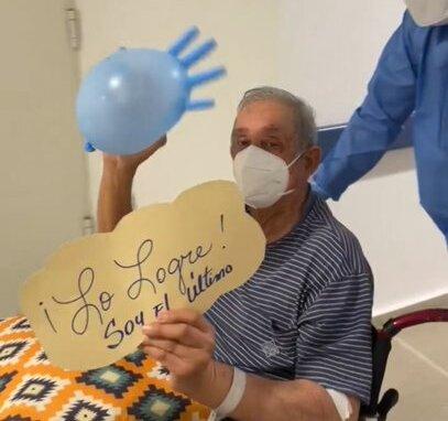 El paciente Manuel Vásquez Mckay, un adulto mayor, recuperado de la enfermedad a su salida muestra en sus manos un letrero que dice: ¡ Lo logré!. Soy el último. Junto a él estaba el equipo médico que lo atendió.
