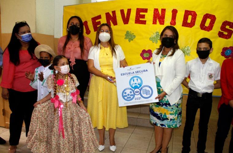 La ministra de Educación, Maruja Gorday de Villalobos, en gira de trabajo realizada en la escuela Pedro J. Sosa hizo entrega a la directora del plantel, Alba Barroso, el certificado de escuela segura, lo que indica que cuentan con las condiciones necesarias para iniciar gradual las clases de manera semipresencial, tal como es el sentir de la comunidad educativa.