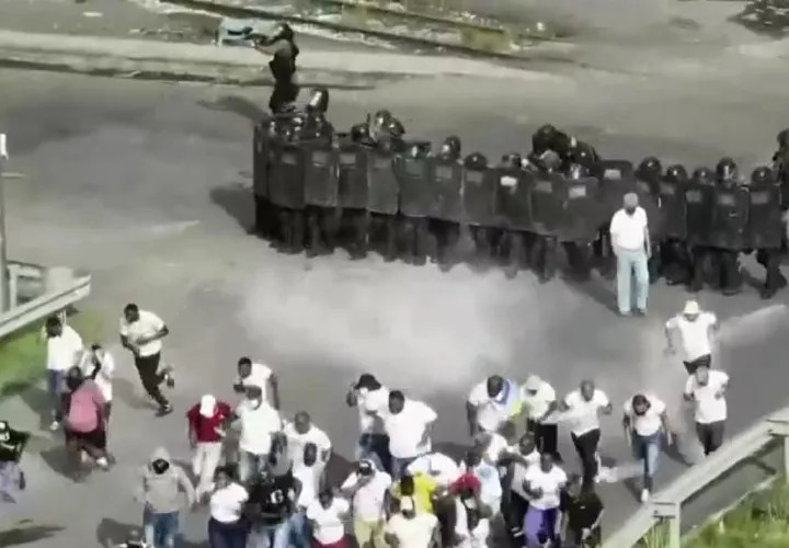 El grupo vestido con camisetas blancas iba en caminata desde la ciudad de Colón hasta el área de Los Cuatro Altos, pero los antimotines los atajaron frente al centro comercial.
