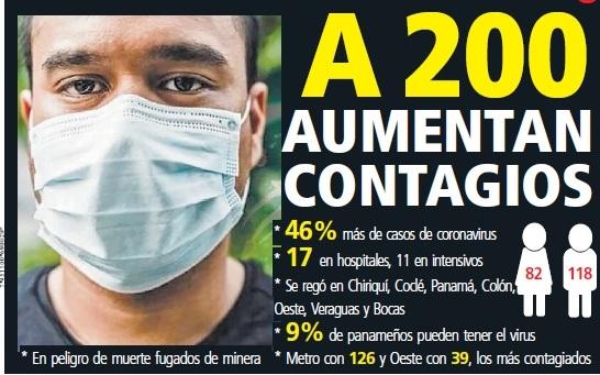 El imparable coronavirus cabalga a todo galope en Panamá. De un día otro el contagio aumentó en 46%, al pasar de 137 casos a 200; pero ahora el Covid-19 llegó a dos nuevas provincias: Chiriquí y Coclé. Ya estaba en Panamá, Panamá Oeste, Veraguas, Colón y Bocas.