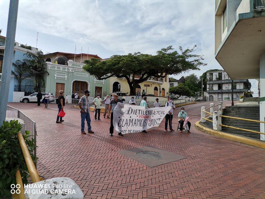 La lucha continúa. Familiares y pacientes afectados por el envenamiento con dietinelglicol, protestan hoy, martes, en las inmediaciones de la Presidencia de la Republica, ubicada en el corregimiento de San Felipe.