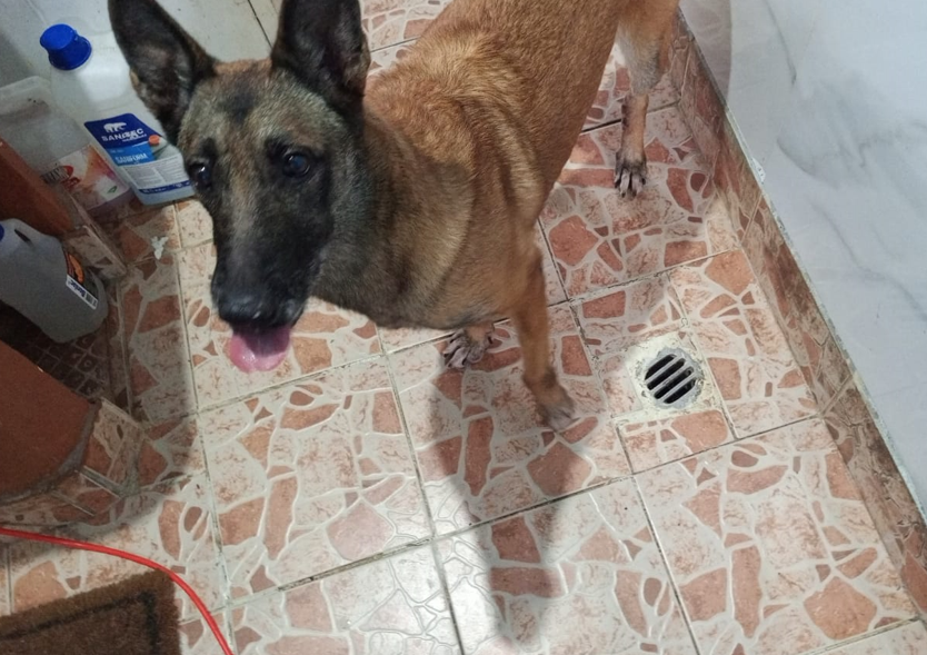 Se trata de una perra de raza Pastor belga Mallinoi, color chocolate marrón cara oscura.