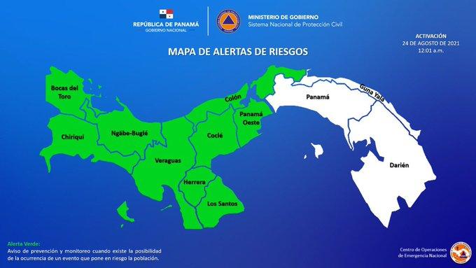 Panamá- El Sistema Nacional de Protección Civil (SINAPROC) declara Alerta Verde en las provincias de Bocas del Toro, Coclé, Colón, Chiriquí, Veraguas, Herrera, Los Santos, Panamá Oeste y comarca Ngäbe-Buglé a partir de las 12:00 a.m., del martes 24 hasta el 26 de agosto de 2021.