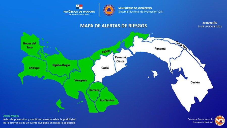 Panamá- El Sistema Nacional de Protección Civil (SINAPROC) declara Alerta Verde Preventiva a partir de la 11:00 a.m. de este viernes para las provincias de Bocas del Toro, Chiriquí, Veraguas, Costa Abajo de Colón, comarca Ngäbe-Buglé y Pensínsula de Azuero.