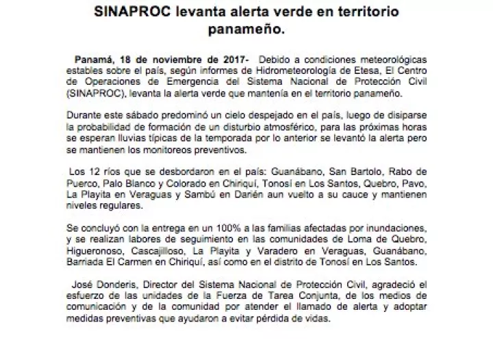 El Sistema Nacional de Protección Civil ( Sinaproc) emitió un comunicado oficial para levantar "alerta verde" en el territorio panameño, debido a condiciones meteorológicas estables sobre el país, según informes de Hidrometeorología de Etesa.