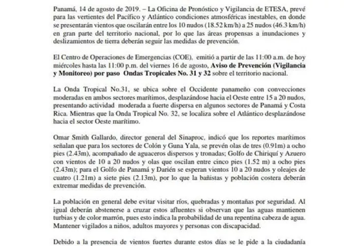 En tanto, El Centro de Operaciones de Emergencias (COE) emitió a partir de las 11:00 a.m. de hoy, miércoles hasta las 11:00 p.m. del viernes 16 de agosto, aviso de prevención por paso Ondas Tropicales No. 31 y 32 sobre el territorio nacional.