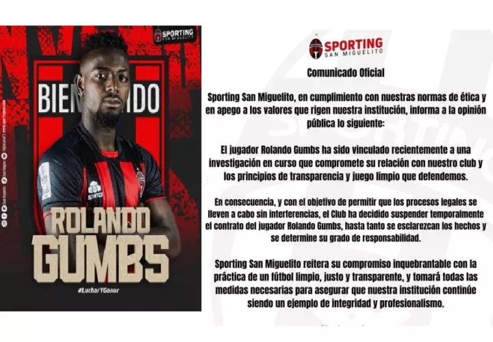 El Sporting San Miguelito anunció la suspensión temporal del jugador Rolando Gumbs, luego de que se viera involucrado en una investigación en curso que pone en riesgo su relación con el club.