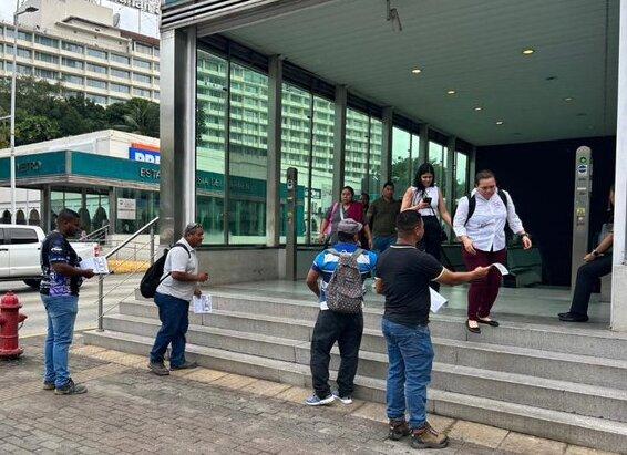 Esta mañana, miembros del Sindicato Único Nacional de Trabajadores de la Industria de la Construcción y Similares (SUNTRACS) llevaron a cabo una jornada de distribución de volantes en la estación de vía España de la Línea 1 del Metro.