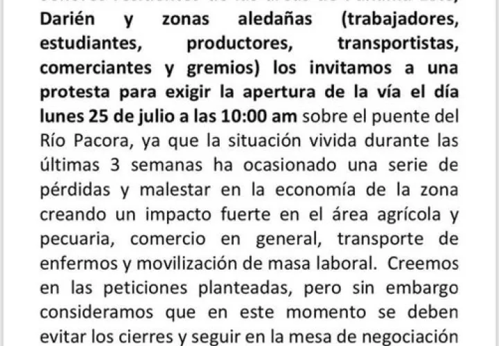 Líderes comunitarios, ganaderos, productores, pescadores y residentes de Chepo, Las Garzas y Darién han advertido que tomarán el control de la situación, ya que a pesar de que hay una mesa única de diálogo, los manifestantes mantienen el cierre de las vías Interamericana y Panamericana.