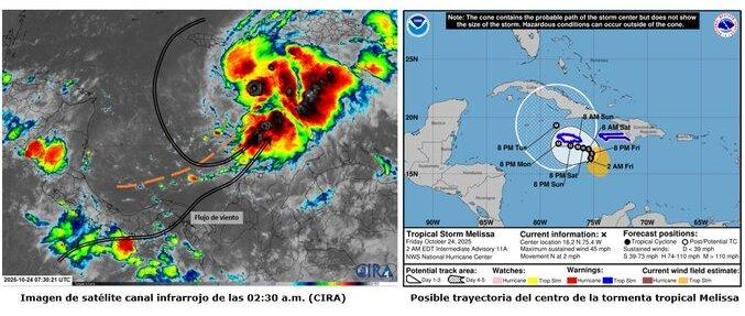 A las 01:00 a.m., el centro de la tormenta tropical Melissa se encontraba en el Mar Caribe, al sureste de Jamaica, con vientos máximos sostenidos de 75 km/h. El sistema se mueve hacia el norte con desplazamiento lento y se espera que se ubique en las Antillas Mayores en los próximos días.