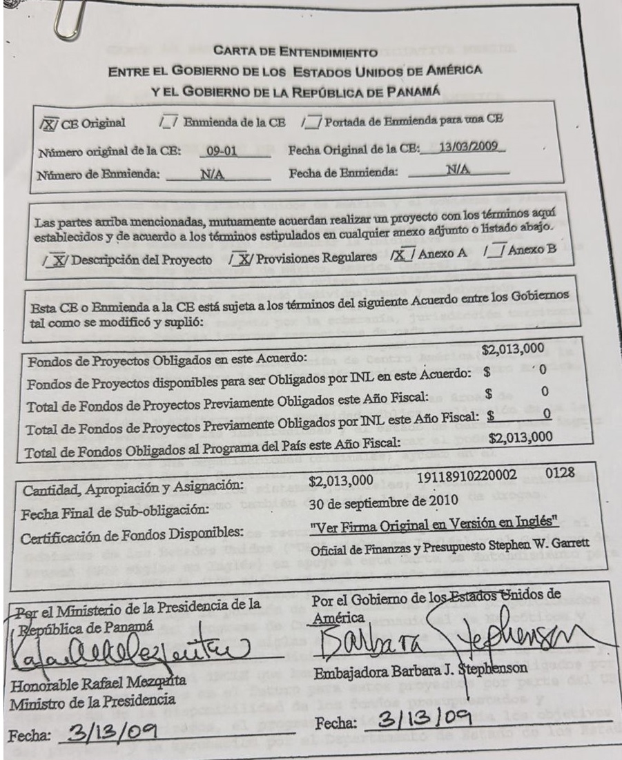 Se trata de la carta de entendimiento firmada el 13 de marzo entre la ex embajadora estadounidense Barbara Stephenson y el ex ministro de la Presidencia, Rafael Mezquita, para proyectos bajo la iniciativa de Mérida, cuyo objetivo fue el combate al narcotráfico.