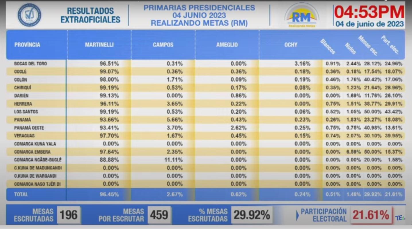 El Tribunal Electoral se encuentran transmitiendo, en vivo, los resultados extraoficial de las elecciones primarias presidenciales del Partido Realizando Metas (RM).