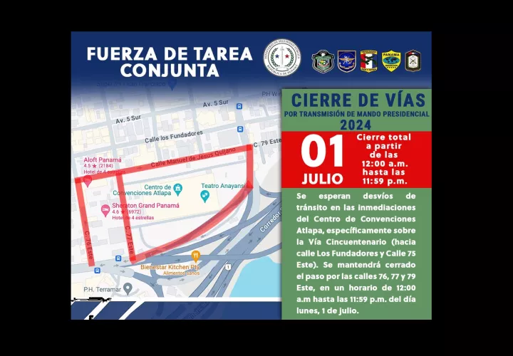 Además, se mantendrá cerrado el paso por las calles 76, 77 y 79 Este desde las 12:01 de la madrugada hasta las 11:59 de la noche del lunes 1 de julio.