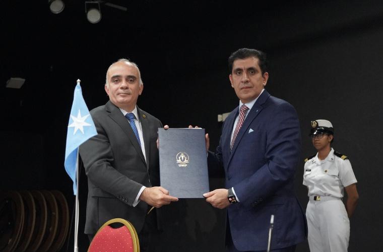 Suscribieron el convenio el rector de la UMIP, Víctor Luna Barahona y Antonio Domínguez, presidente de Centroamérica y el Caribe de Maersk.