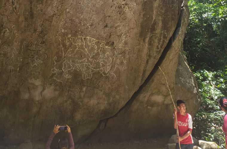 Madelaine hizo una pausa especial cuando llegamos a la Piedra Pintada. Una enorme roca con símbolos grabados, que nuestra guía sostiene que se trata de un mapa del lugar. Esa roca tiene 35 mil años y rajadura que presenta fue producto de un rayo, expresa muy segura la guía quinceañera.