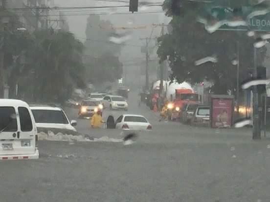 El Sistema Nacional de Protección Civil de Panamá (Sinaproc) colgó en su página oficial de Twitter fotografías en las que se puede ver que el nivel de agua acumulada alcanza el medio metro en varios puntos de la capital y en las que hay varios vehículos semi flotando en medio de la calle.