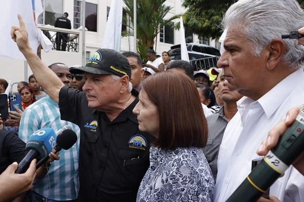 Martinelli llegó al lugar en compañía de su esposa, Marta Linares, y del aspirante a vicepresidente, José Raúl Mulino, y manifestó que está protestando por sus derechos y por el de los panameños a tener un torneo electoral en el que se pueda escoger libremente a los candidatos de su preferencia sin que este devenir se decida en el palacio de justicia.
