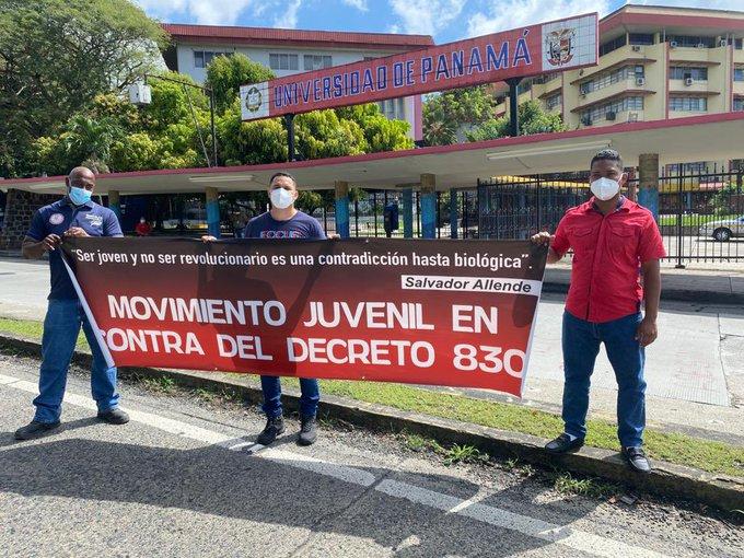 Miembros del "Movimiento Juvenil contra el Decreto 830" se encuentran protestando hoy, miércoles, en la vía Transístmica,frente a la Universidad de Panamá para exigir la derogación de los decretos ejecutivos 830 y 833, y que se garanticen los salarios de los trabajadores.