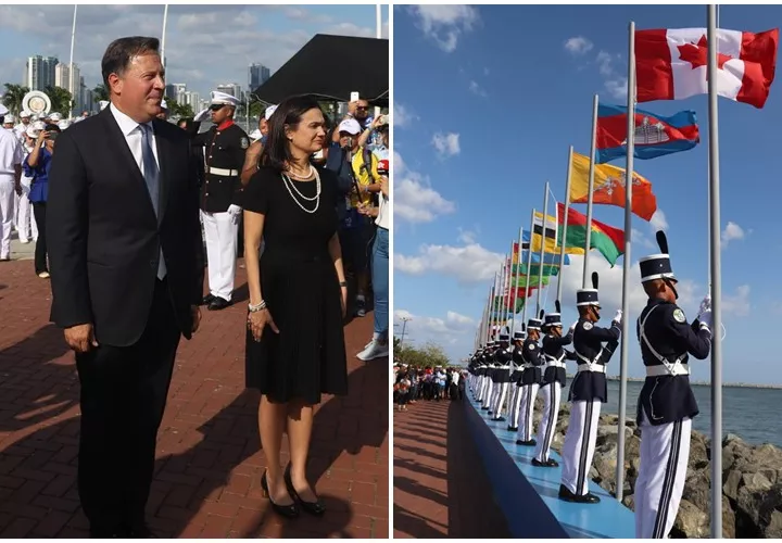 Con el sonido de la pieza musical Honores al Pabellón, el presidente de la República, Juan Carlos Varela, y la vicepresidenta y Canciller Isabel De Saint Malo de Alvarado presidieron el acto de izada de la bandera nacional, al tiempo que daban por inaugurado el Paseo de las Naciones, ubicado en la Cinta Costera 3.