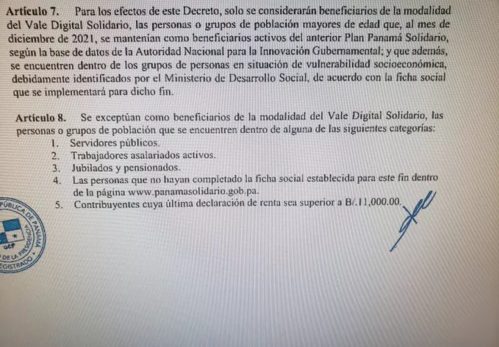 Solo se considerarán beneficiarios de la modalidad del Vale Digital Solidario, las personas o grupos de población mayores de edad que, al mes de diciembre de 202I, se mantenían como beneficiarios activos del anterior Plan Panamá Solidario, según la base de datos de la Autoridad Nacional para la Innovación Gubemainental; y que además, se encuentren dentro de los grupos de personas en situación de vulnerabilidad socioeconómica, debidamente identificados por el Ministerio de Desarrollo Social, de acuerdo con la ficha social que se implementará.