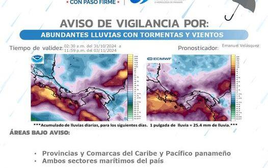 El Instituto de Meteorología e Hidrología de Panamá ha emitido un aviso de vigilancia por abundantes lluvias, acompañadas de tormentas eléctricas y vientos significativos en todo el país y en las zonas marítimas. Las áreas bajo vigilancia incluyen las provincias, así como la comarca del Caribe y el Pacífico, además de ambos sectores marítimos del país.