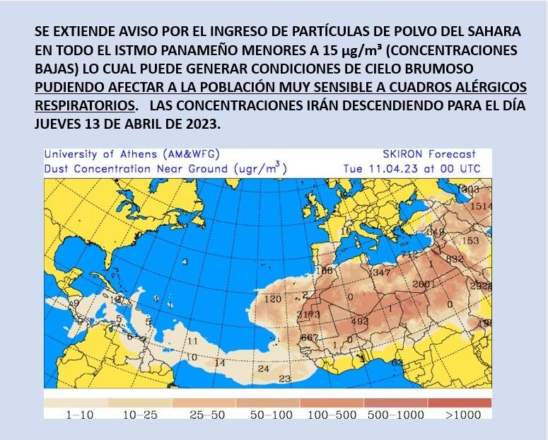 El Instituto de Meteorología e Hidrología de Panamá (Imhpa) informó que el aviso de vigilancia por la presencia en el país de partículas del polvo del Sahara está vigente hasta mañana, jueves 13 de abril.