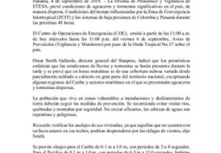 El Centro de Operaciones de Emergencias (COE), emitió a partir de las 11:00 a.m. de hoy ,miércoles hasta las 11:00 p.m. del viernes 6 de septiembre, un aviso de prevención (Vigilancia y Monitoreo) por paso de la Onda Tropical No.37 sobre el país.