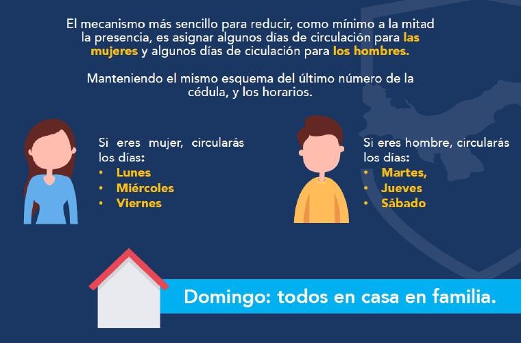Las mujeres podrán salir los días lunes, miércoles y viernes; mientras que los hombres saldrán martes, jueves y sábados. El domingo nadie podrá moverse de casa.