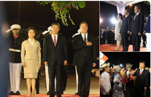Xi y su esposa y primera dama china, Peng Liyuan, llegaron en un avión de Air China al aeropuerto internacional de Tocumen, aproximadamente a las 8 de la noche y fueron recibidos con honores por el presidente Varela y su esposa y primara dama panameña, Lorena Castillo.