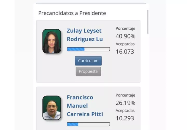Por tercera semana, la diputada del Partido Revolucionario Democrático (PRD), Zulay Rodríguez, encabeza la lista de recolección de firmas de los precandidatos independientes que aspiran a la presidencia de la República.
