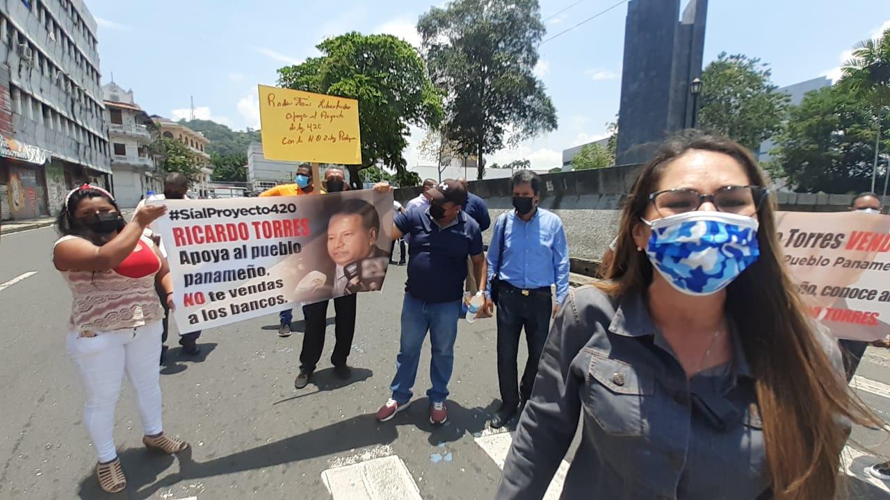 La diputada Zulay Rodríguez y un grupo de panameños protestaron en la parte exterior de la Asamblea Nacional para exigir al colega y copartidario Ricardo Torres, jefe de la bancada del PRD, que apoye al pueblo y se sume favorablemente al proyecto de ley 420, que busca establecer un marco regulatorio a las tasas de intereses de préstamos y créditos otorgados por bancos, empresas financieras y tarjetas de créditos por motivo de la pandemia del COVID- 19.