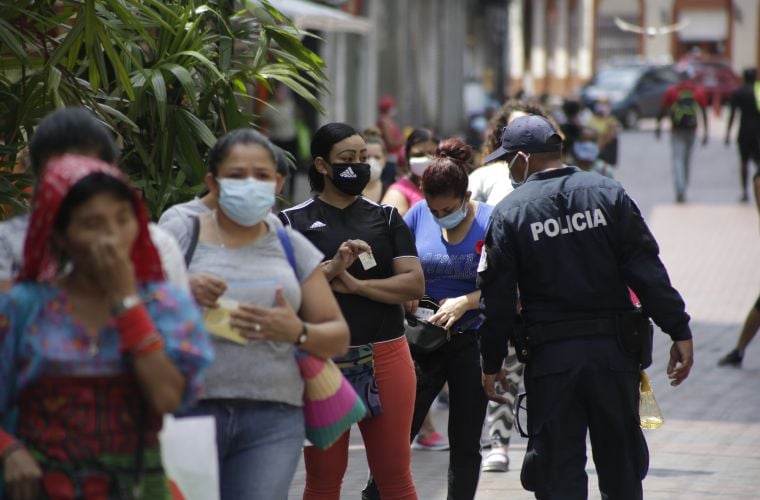 Un grupo de hombres con mascarillas forman filas respetando la distancia para pagar la tarifa de agua en la sede del Instituto de Acueductos y Alcantarillados Nacionales (Idaan), ubicada en San Miguelito.