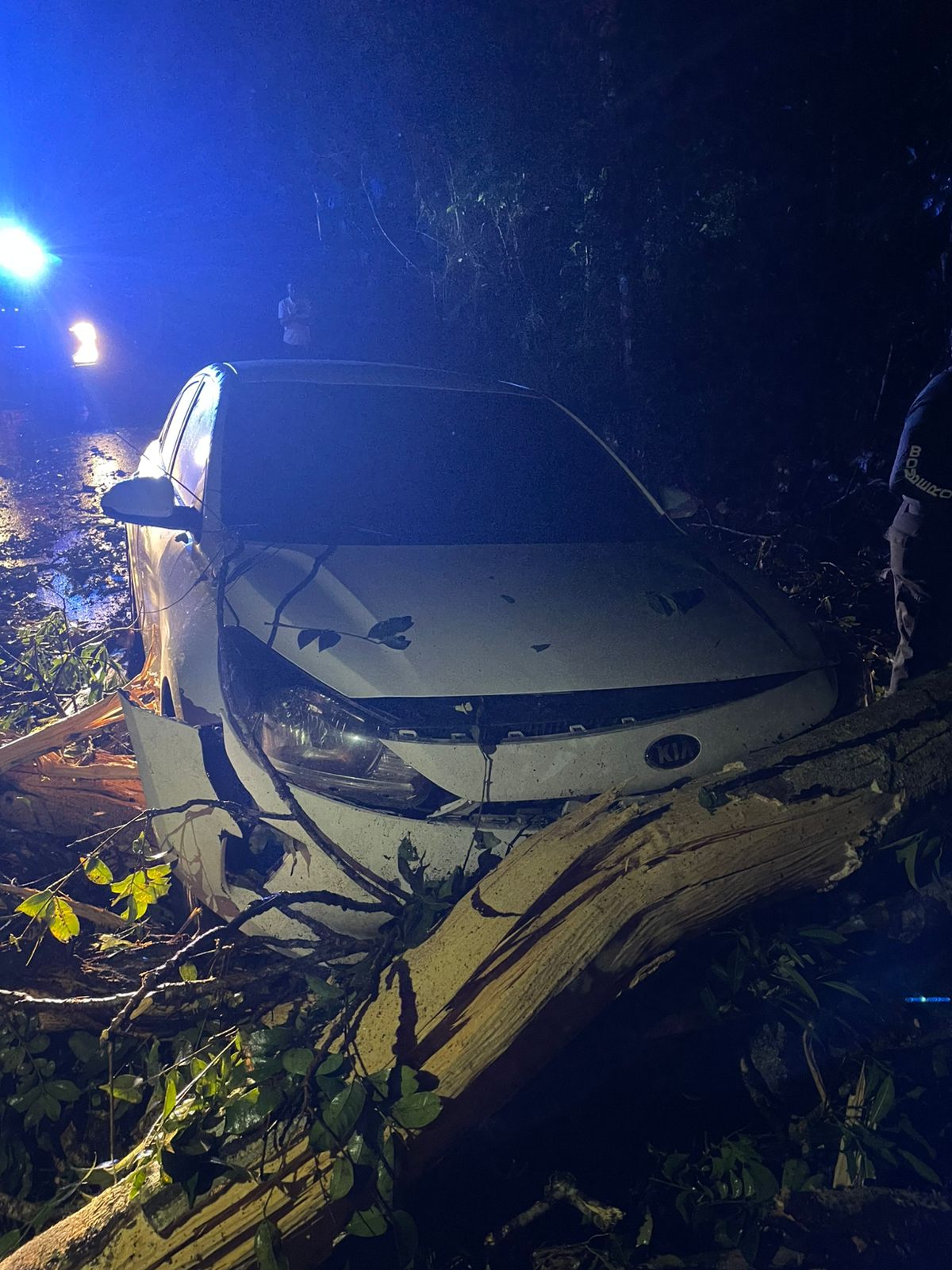 Uno de los árboles terminó encima de un sedán y del tendido eléctrico, generando un serio riesgo en plena carretera.