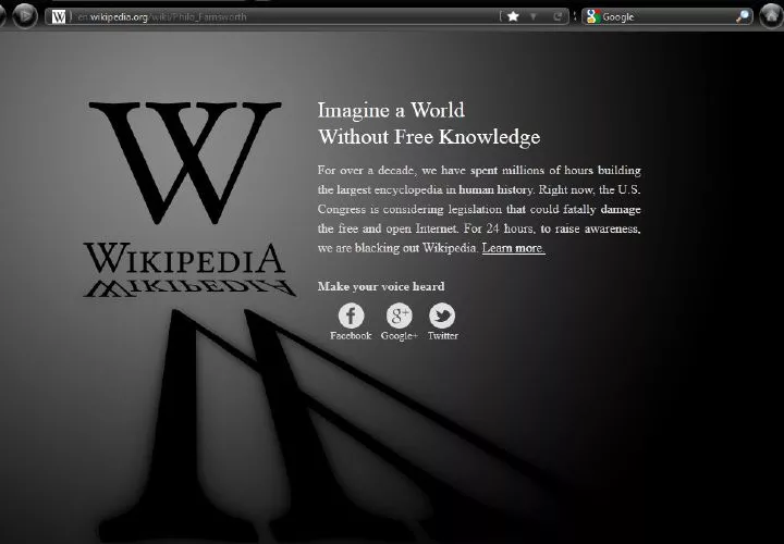 El 18 de enero de 2012, la ley SOPA apagó la página de Wikipedia en inglés por 24 horas a las 05:00 UTC. Mientras duró el apagón, quienes intentaron acceder al sitio se encontraron con una pantalla negra en la que se podía leer «Imagina un mundo sin conocimiento libre».