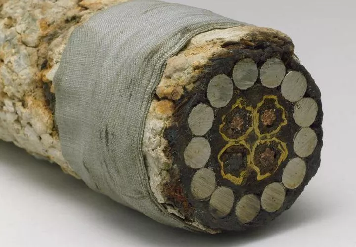 El 27 de julio de 1866 se inaugura el primer cable telegráfico trasatlántico de 3,700 km de longitud que une Europa con América, más concretamente Irlanda con Terranova. Cyrus Field, ciudadano americano, ha financiado la operación con su fortuna particular. En la foto, una muestra del cable.