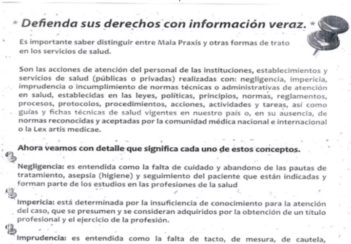 Ante la indefensión que tiene el paciente, por la constante violación de sus derechos, hacemos de su conocimiento cómo identificar una mala praxis, documento distribuido por el movimiento Cinta Chocolate 30 de abril: