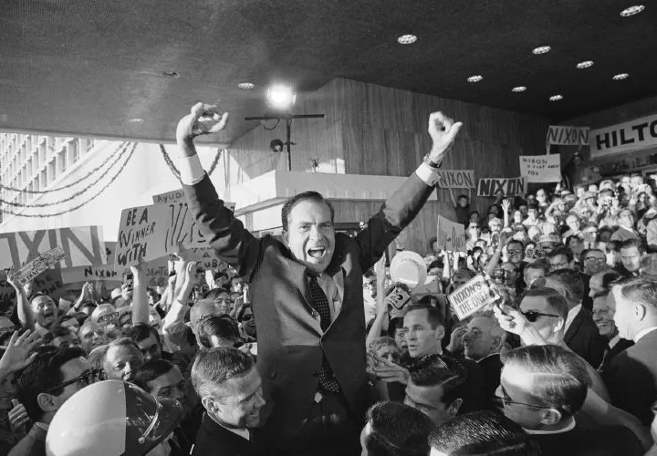 Richard Nixon, candidato republicano, gana por estrecho margen las elecciones para la presidencia el 5 de noviembre de 1968. Tras un reñido recuento de votos, que ha puesto al país al borde de una crisis constitucional, el vicepresidente demócrata Hubert Humphrey le concede a Nixon la victoria, tras 24 horas de tensa espera en el recuento. Al final, el escándalo Watergate terminará obligando a Nixon a convertirse en el primer presidente de la historia de EE.UU. en renunciar.
