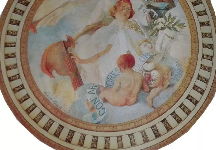 Sigue una figura de mujer que, haciendo alarde del más puro clasicismo, se levanta gallardamente, de espaldas al observador, sobre un pedazo de fondo claro. Tropezamos en el camino con una banda de amorcillos que, como en coro de alados copos de nieves sonrojada por la Aurora, cruza en un bullicioso trinar de alegres golondrinas. Nos encontramos con la Fama, que tendida sus alas azules, levanta al cielo sus trompetas de oro anunciando que ha llegado la hora de la redención. Entre el Sol, que nace, y la Noche, que huye, la Fama es un gran estudio de luz, donde el talento de Lewis ha hecho de sus vastos y sólidos conocimientos de la estructura humana.