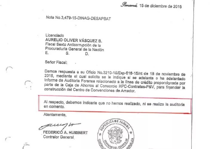 Para intentar obtener la única prueba idónea sobre la existencia de una lesión patrimonial al Estado, la fiscalía remitió tres (3) oficios al contralor Federico Humbert preguntando “si realiza o si ha realizado un Informe de Auditoría Forense relacionada a la línea de crédito de la Caja de Ahorros al Consorcio HPC-Contratas-P&V”.